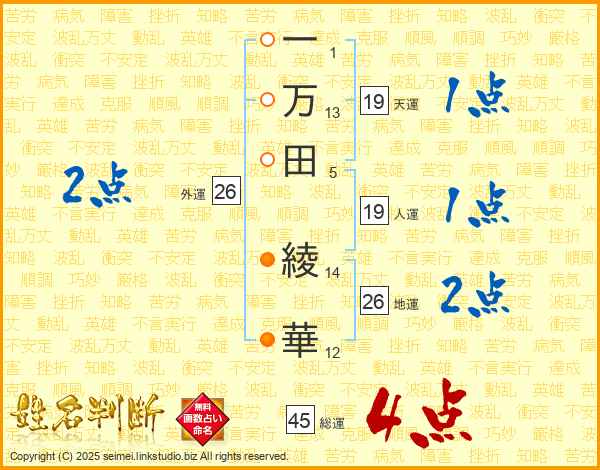 一(1画)万(13画)田(5画) 綾(14画)華(12画)