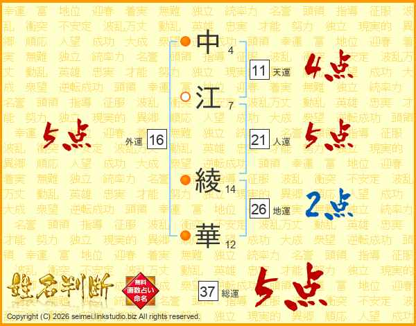 あなたの人生を表す1番重要な運勢です。生涯を通じて影響する総合運となり、主に50歳以降の晩年期に影響を及ぼします。苗字と名前の合計画数。