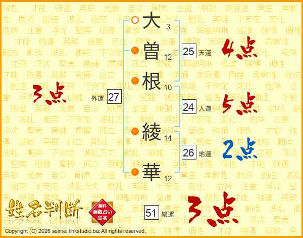 大(3画)曽(12画)根(10画) 綾(14画)華(12画)