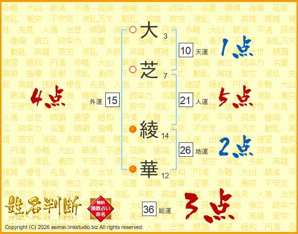 大(3画)芝(7画) 綾(14画)華(12画)