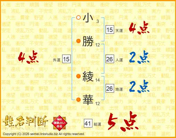 生活面を象徴する運勢です。外部から受ける影響力を表し、結婚運、家庭運や職場、環境への順応性を表します。総運から人運を引いた画数。姓や名が1文字の場合を除く。