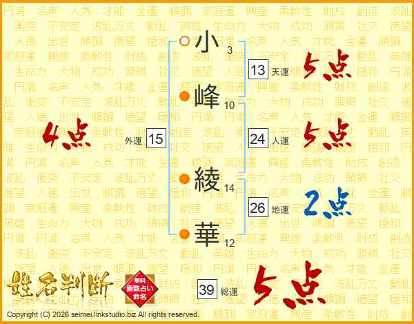 小峰綾華さんの総運は39画の5点!