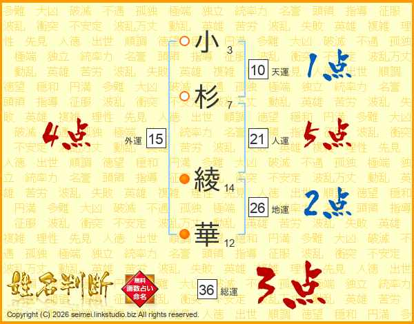 小(3画)杉(7画) 綾(14画)華(12画)