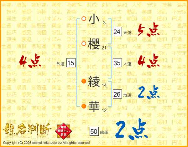 小(3画)櫻(21画) 綾(14画)華(12画)