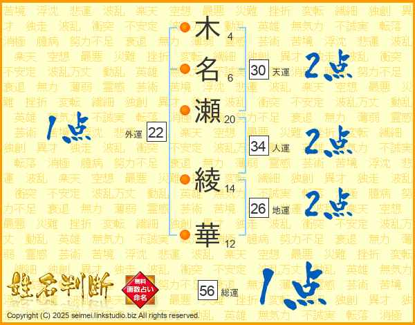 木(4画)名(6画)瀬(20画) 綾(14画)華(12画)