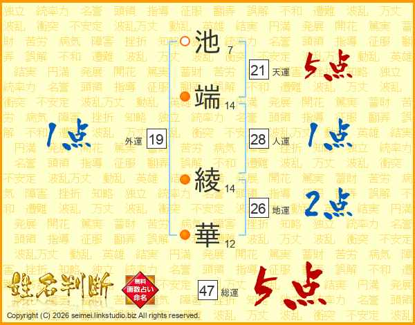 生活面を象徴する運勢です。外部から受ける影響力を表し、結婚運、家庭運や職場、環境への順応性を表します。総運から人運を引いた画数。姓や名が1文字の場合を除く。