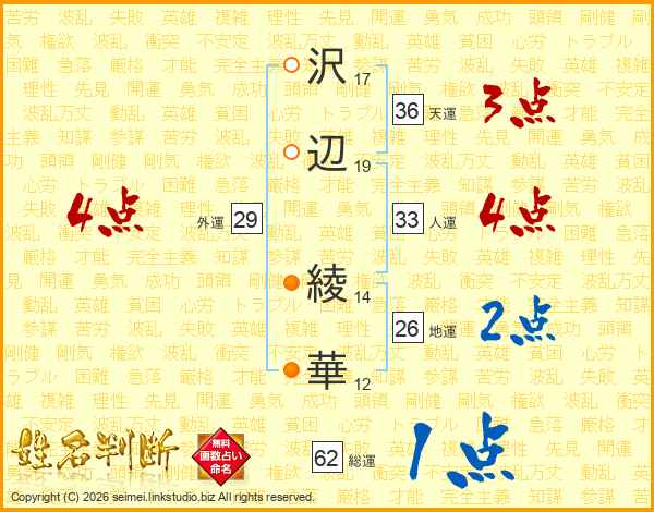 沢(17画)辺(19画) 綾(14画)華(12画)