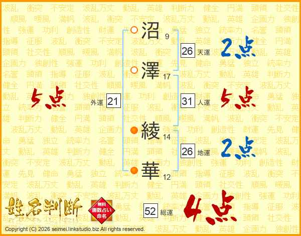 沼(9画)澤(17画) 綾(14画)華(12画)