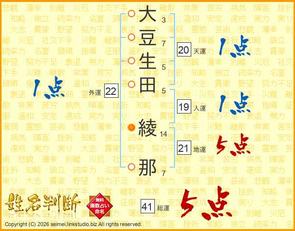 大(3画)豆(7画)生(5画)田(5画) 綾(14画)那(7画)