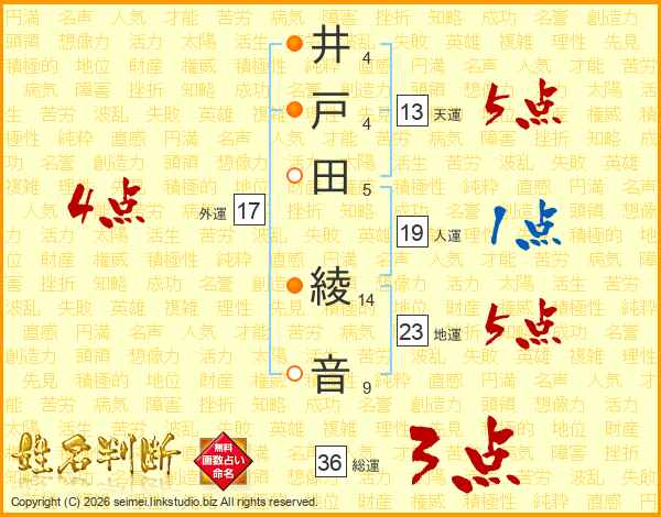 井(4画)戸(4画)田(5画) 綾(14画)音(9画)