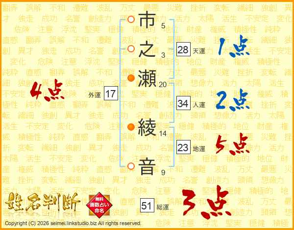 市(5画)之(3画)瀬(20画) 綾(14画)音(9画)