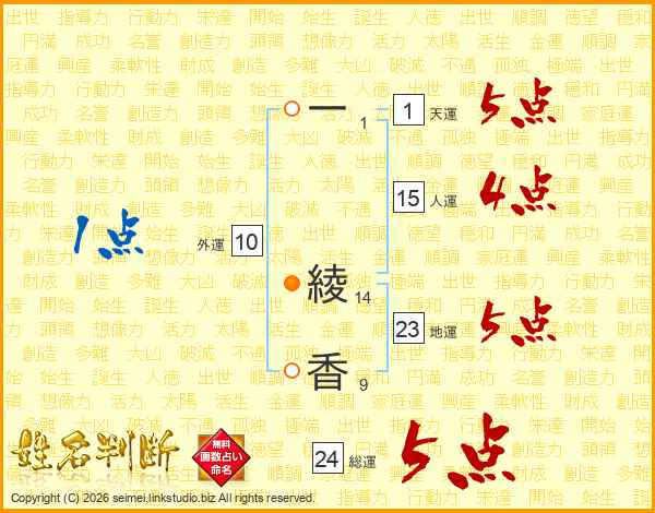 生活面を象徴する運勢です。外部から受ける影響力を表し、結婚運、家庭運や職場、環境への順応性を表します。総運から人運を引いた画数。姓や名が1文字の場合を除く。