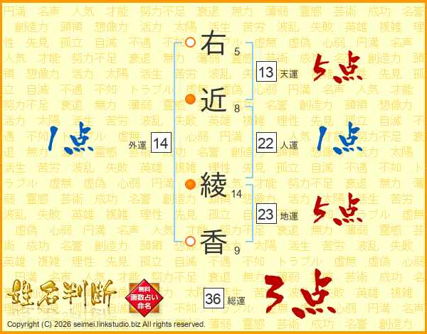 右(5画)近(8画) 綾(14画)香(9画)
