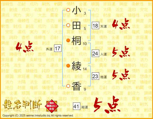 小(3画)田(5画)桐(10画) 綾(14画)香(9画)
