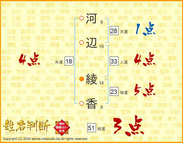 河(9画)辺(19画) 綾(14画)香(9画)