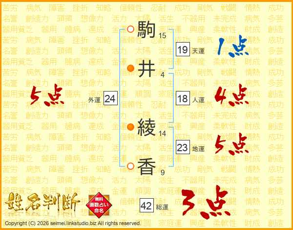 駒(15画)井(4画) 綾(14画)香(9画)