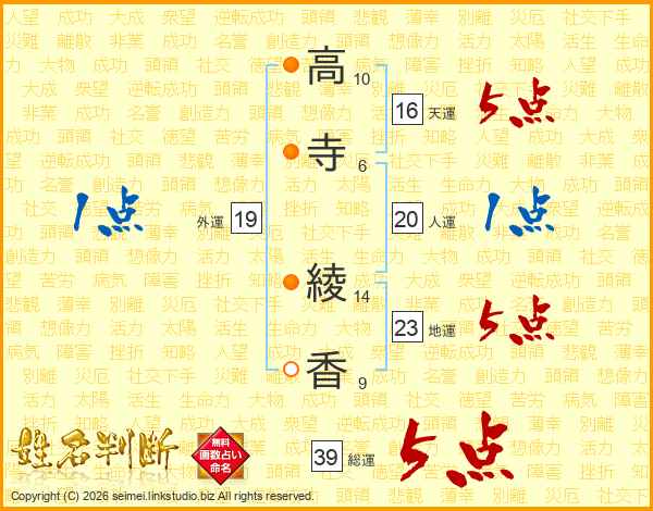 高(10画)寺(6画) 綾(14画)香(9画)