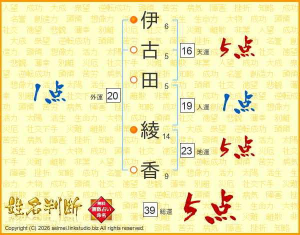 伊(6画)古(5画)田(5画) 綾(14画)香(9画)