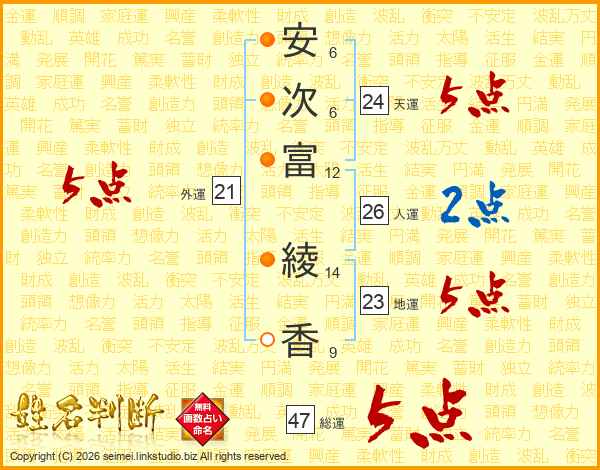 安(6画)次(6画)富(12画) 綾(14画)香(9画)