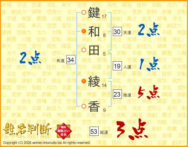 鍵(17画)和(8画)田(5画) 綾(14画)香(9画)