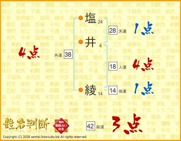 生活面を象徴する運勢です。外部から受ける影響力を表し、結婚運、家庭運や職場、環境への順応性を表します。総運から人運を引いた画数。姓や名が1文字の場合を除く。