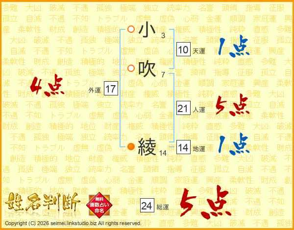 小(3画)吹(7画) 綾(14画)