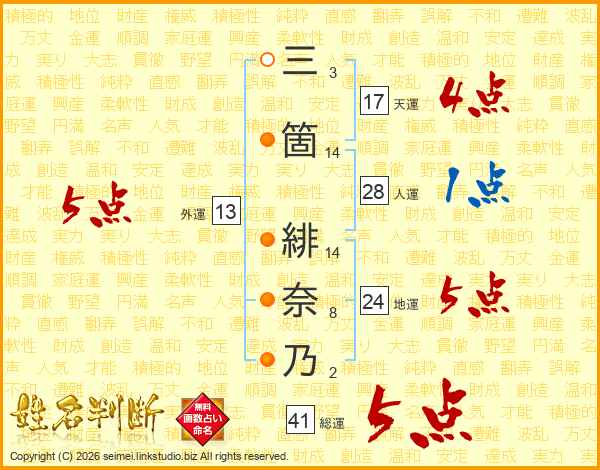三(3画)箇(14画) 緋(14画)奈(8画)乃(2画)