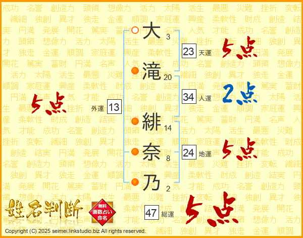 大(3画)滝(20画) 緋(14画)奈(8画)乃(2画)