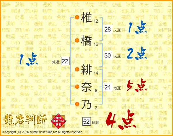 椎(12画)橋(16画) 緋(14画)奈(8画)乃(2画)