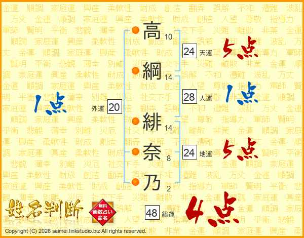 高(10画)綱(14画) 緋(14画)奈(8画)乃(2画)