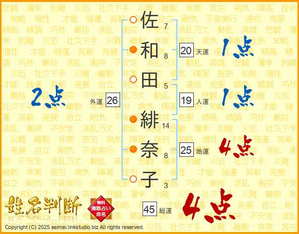 佐(7画)和(8画)田(5画) 緋(14画)奈(8画)子(3画)