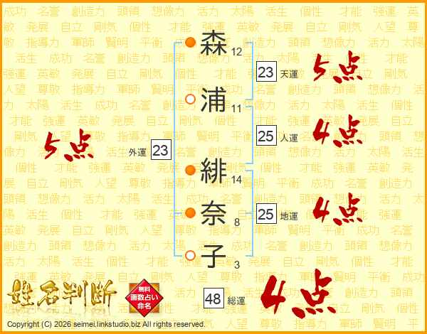 森(12画)浦(11画) 緋(14画)奈(8画)子(3画)