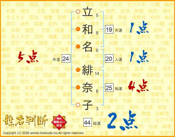立(5画)和(8画)名(6画) 緋(14画)奈(8画)子(3画)