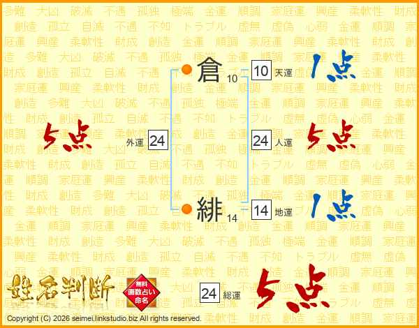 生活面を象徴する運勢です。外部から受ける影響力を表し、結婚運、家庭運や職場、環境への順応性を表します。総運から人運を引いた画数。姓や名が1文字の場合を除く。