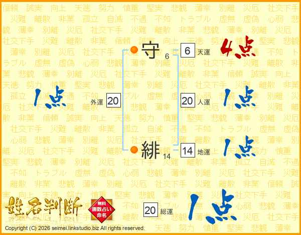 生活面を象徴する運勢です。外部から受ける影響力を表し、結婚運、家庭運や職場、環境への順応性を表します。総運から人運を引いた画数。姓や名が1文字の場合を除く。