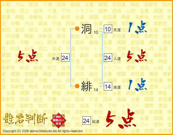 生活面を象徴する運勢です。外部から受ける影響力を表し、結婚運、家庭運や職場、環境への順応性を表します。総運から人運を引いた画数。姓や名が1文字の場合を除く。