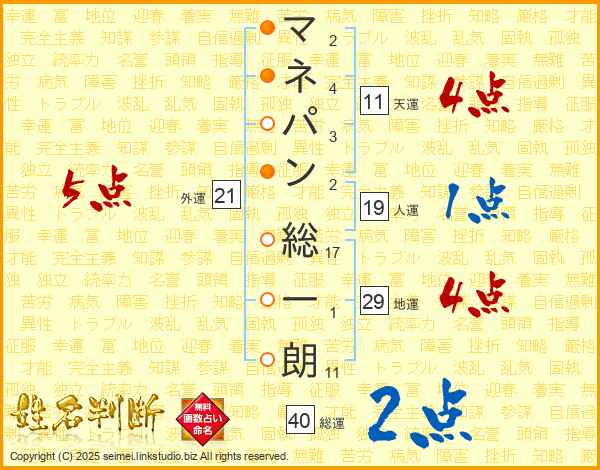 マ(2画)ネ(4画)パ(3画)ン(2画) 総(17画)一(1画)朗(11画)