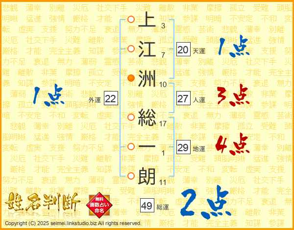 上(3画)江(7画)洲(10画) 総(17画)一(1画)朗(11画)