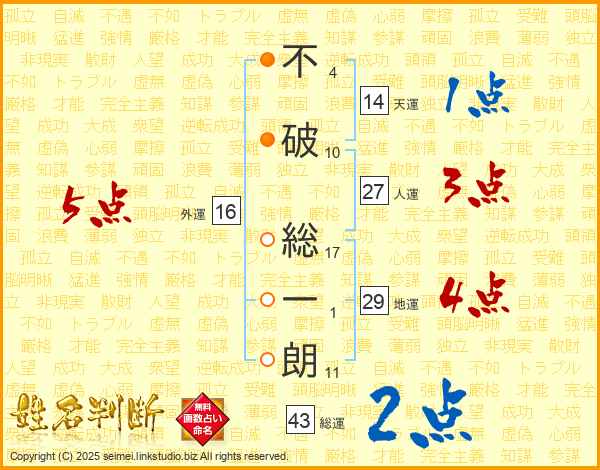 不(4画)破(10画) 総(17画)一(1画)朗(11画)