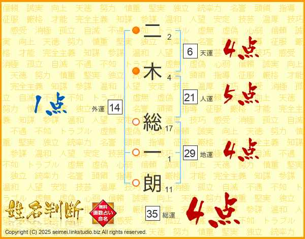 二(2画)木(4画) 総(17画)一(1画)朗(11画)