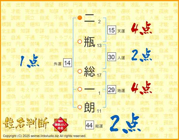 生活面を象徴する運勢です。外部から受ける影響力を表し、結婚運、家庭運や職場、環境への順応性を表します。総運から人運を引いた画数。姓や名が1文字の場合を除く。