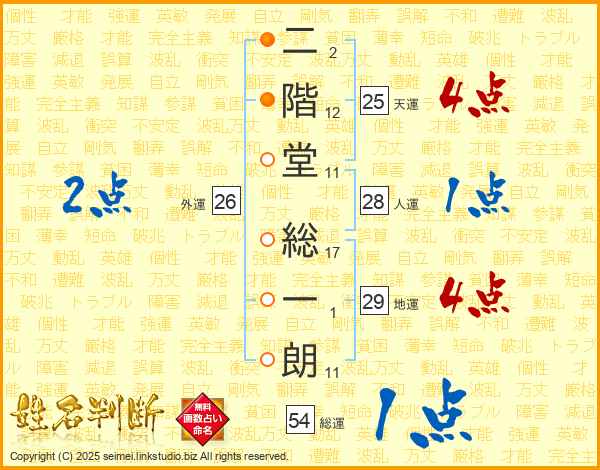 二(2画)階(12画)堂(11画) 総(17画)一(1画)朗(11画)