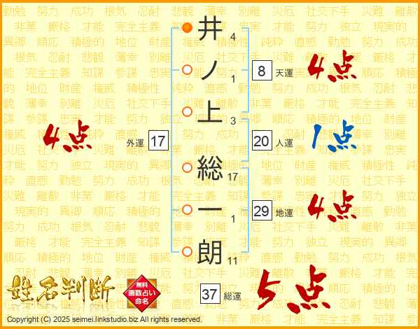 井(4画)ノ(1画)上(3画) 総(17画)一(1画)朗(11画)