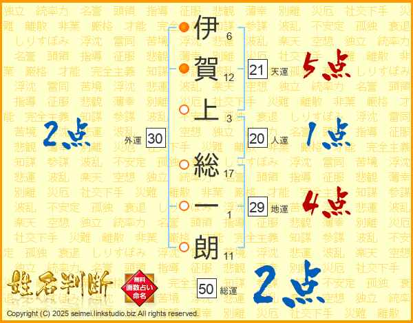 伊(6画)賀(12画)上(3画) 総(17画)一(1画)朗(11画)