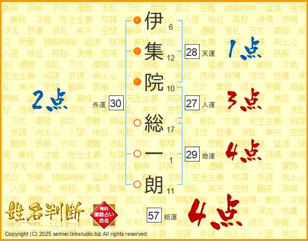 伊(6画)集(12画)院(10画) 総(17画)一(1画)朗(11画)