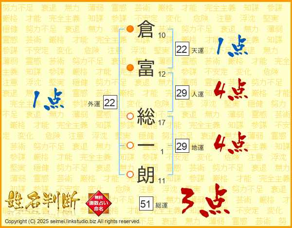 倉(10画)富(12画) 総(17画)一(1画)朗(11画)