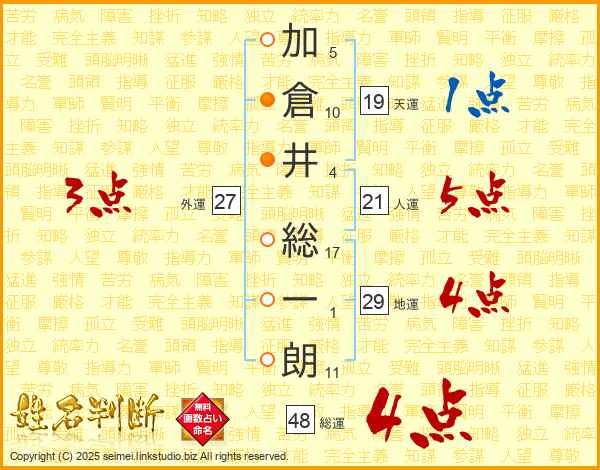 加(5画)倉(10画)井(4画) 総(17画)一(1画)朗(11画)