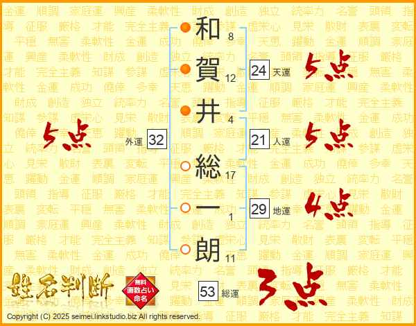 和(8画)賀(12画)井(4画) 総(17画)一(1画)朗(11画)