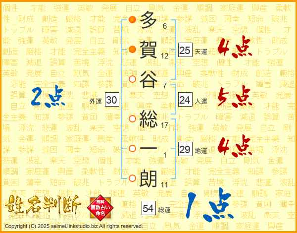 多(6画)賀(12画)谷(7画) 総(17画)一(1画)朗(11画)