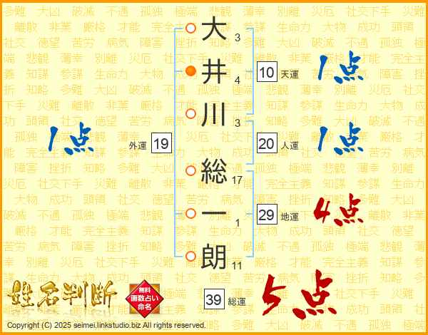 大(3画)井(4画)川(3画) 総(17画)一(1画)朗(11画)